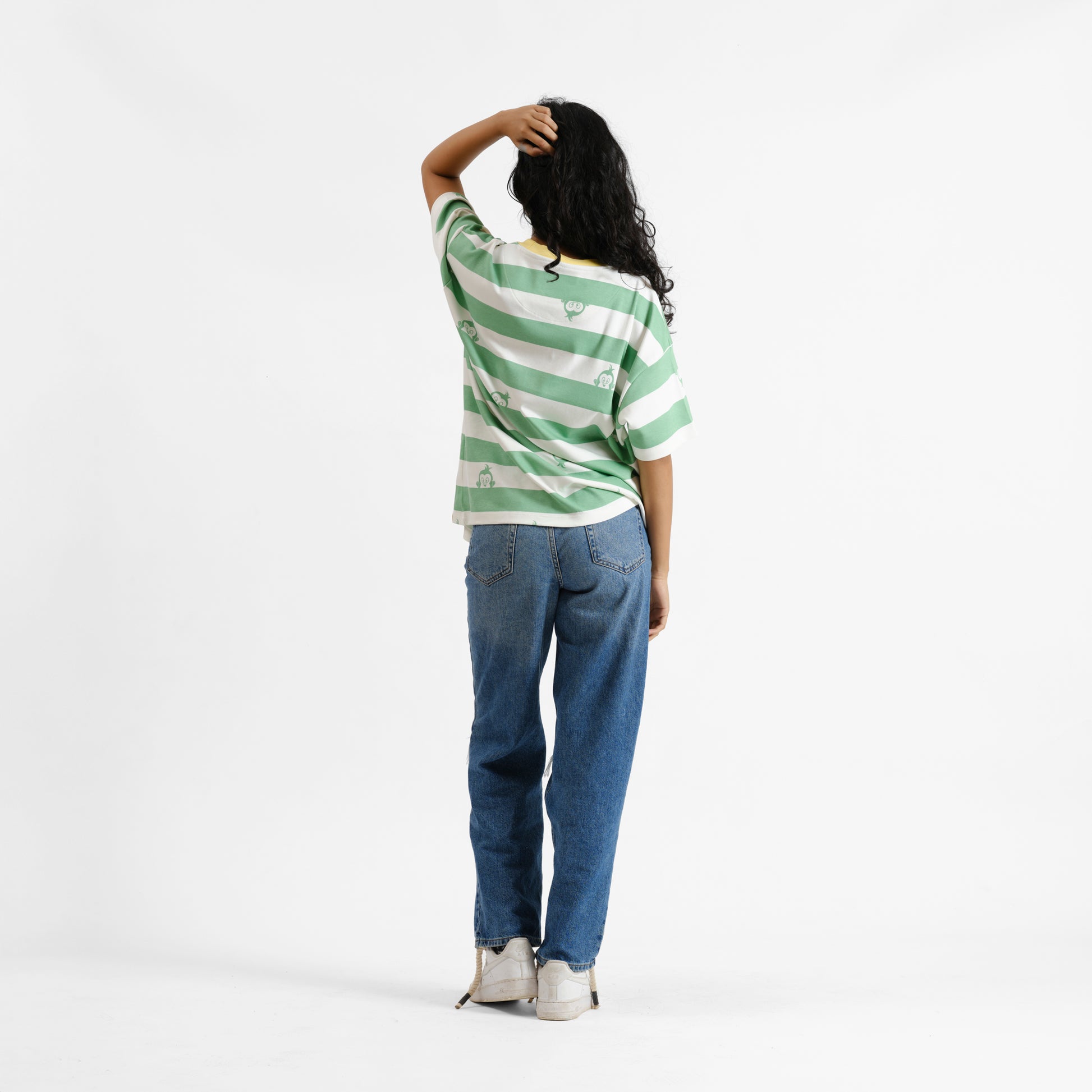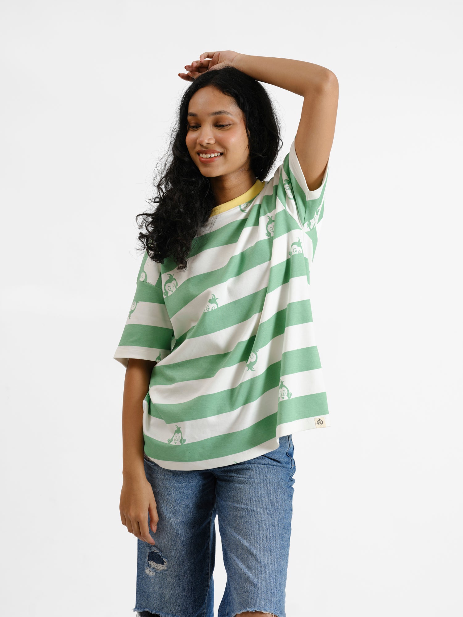 This tee looks polite from afar – stripes, soft tones, nice oversized drape – and then you spot the monkeys. Tiny little surprises peeking out from between the lines like they’re trying not to panic. Made from organic cotton, it’s the perfect fit for when you’re feeling emotionally horizontal.
